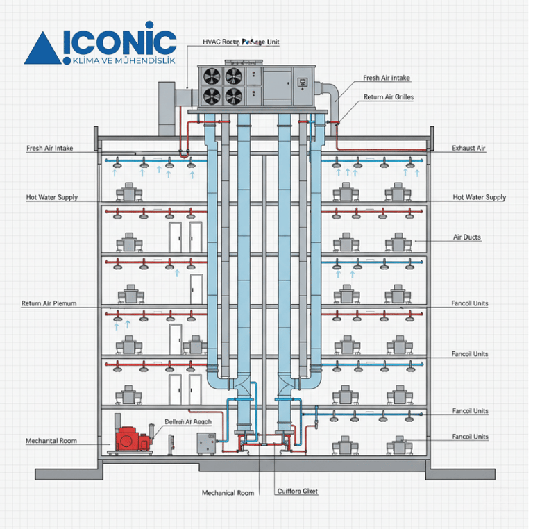 Taze Hava İhtiyacı: Özellikle restoran, toplantı salonu gibi kapalı ve kalabalık yerlerde klima sistemine entegre taze hava temini önemlidir. Bu, genellikle Klima Santralleri veya Paket Tipi klimalarla sağlanır.